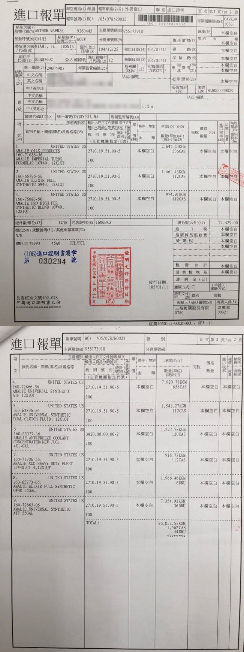 愛馬力機油-2016進口報單