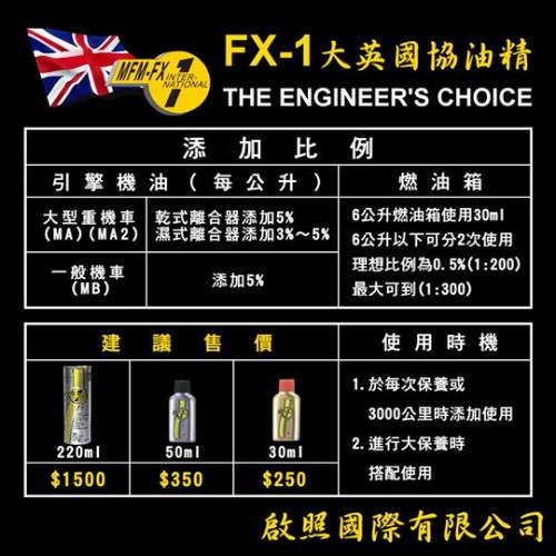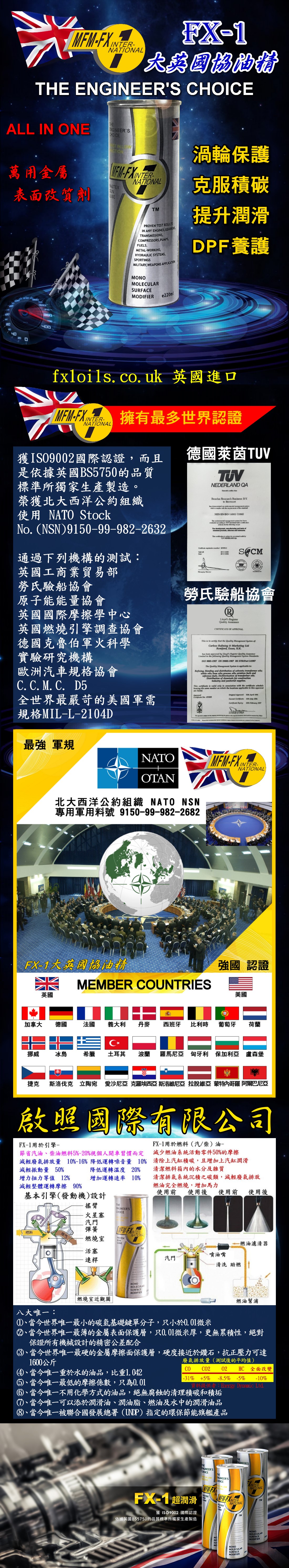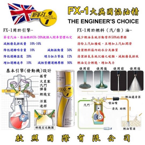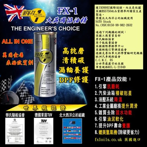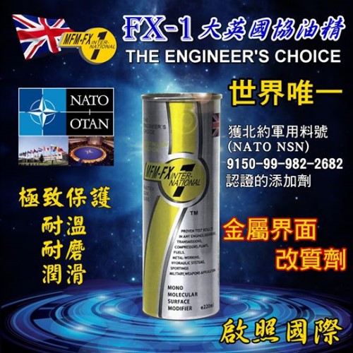 FX-1大英國協金屬表面改質劑, 是大英國協基於環保理念所研發出的國防科技新產品,對人體完全無害的微分子潤滑油;是能源的原動力,是一種碳氫化合物的單分子(液態)金屬表面改質劑。能滲入金屬細孔,消除一切粗糙(如積碳,油泥)在金屬表面形成0.05um的單分子超滑薄膜,能耐高溫、耐超高壓、抗磨蝕。FX1 是大英國協基於環保理念所研發出的國防科技新產品,對人體完全無害的微分子潤滑油;是能源的原動力,是一種碳氫化合物的單分子(液態)金屬表面改質劑。能滲入金屬細孔,消除一切粗糙(如積碳,油泥)在金屬表面形成0.05um的單分子超滑薄膜,能耐高溫、耐超高壓、抗磨蝕。FX1 是大英國協基於環保理念所研發出的國防科技新產品,對人體完全無害的微分子潤滑油;是能源的原動力,是一種碳氫化合物的單分子(液態)金屬表面改質劑。能滲入金屬細孔,消除一切粗糙(如積碳,油泥)在金屬表面形成0.05um的單分子超滑薄膜,能耐高溫、耐超高壓、抗磨蝕。