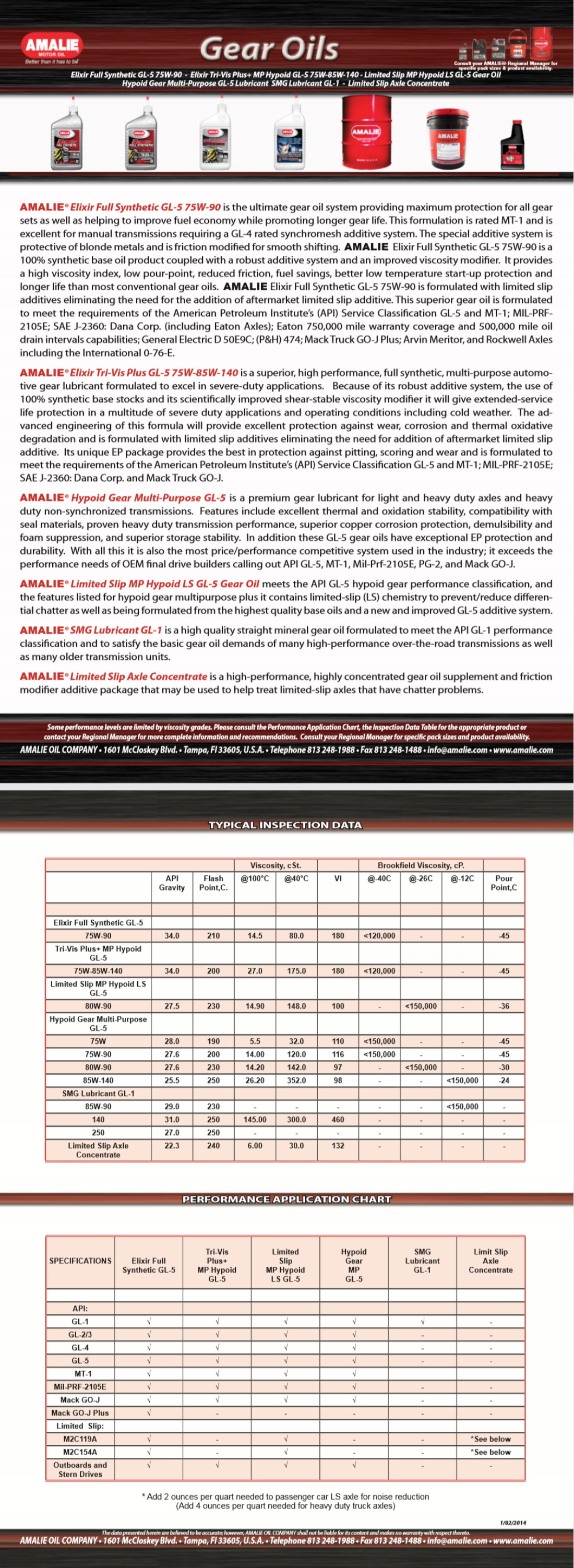AMALIE Elixir全合成GL-5 75W-90是100%合成基礎油產品,具有強大的添加劑體系和改進的粘度調節劑。